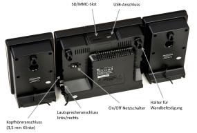 - Anschlüsse: USB/SD-Eingang (oben liegend), 3,5mm-Klinke-AUX-Eingang, 3,5mm-Klinke-Kopfhörer-Ausgang, Stereo-Cinch-Audio-Ausgänge zum Anschluss der Lautsprecher (Kabel boxenseitig integriert)