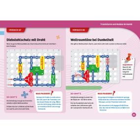 Die zahlreichen Experimente und kindgerechten „Nachgehakt“-Seiten der vierfarbigen Anleitung verdeutlichen und erklären die Hintergründe und die ersten elektronischen Begriffe. Ein durchdachtes und kindgerechtes Konzept für den Einstieg in die Elektronik. Beispiele der über 100 Experimente: Motorsteuerung mit Magnetschalter, Schaltungen mit NPN- und PNP-Transistoren, Alarmanlage, UKW Empfang (FM), Wasser- und Feuchtemelder, Digitale Grundschaltungen, Sound-Schaltkreise, Verstärker und Lautsprecher, Mikrofon gesteuerte Schaltungen, Lichtgesteuerte Schaltungen mit Fototransistor.